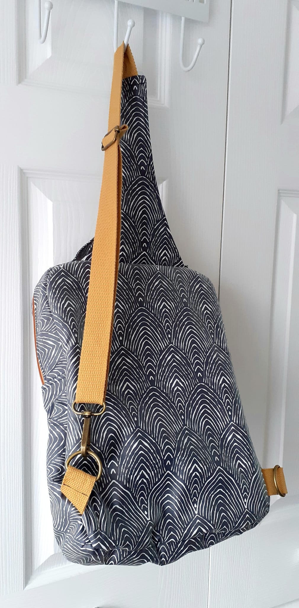 The bag features a comfy shoulder strap and I used slightly wider (1.25") webbing and hardware than the pattern requires, working with what I had available. There are two rings at the bottom depending on which shoulder you prefer to wear the bag on.