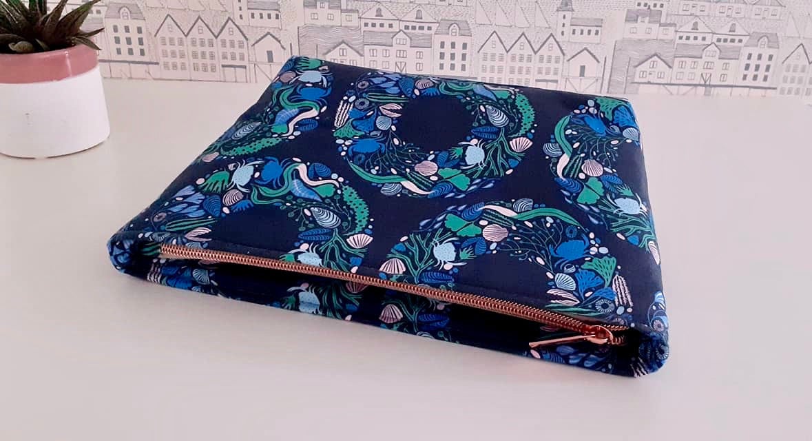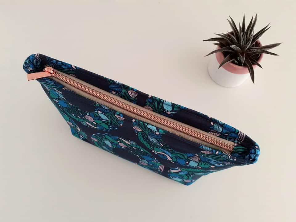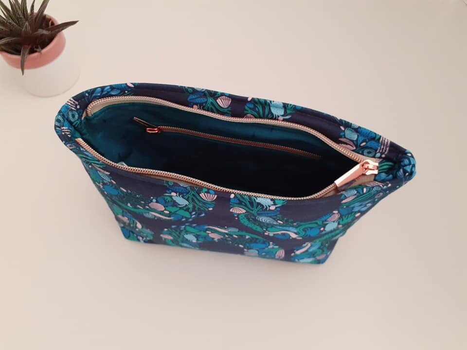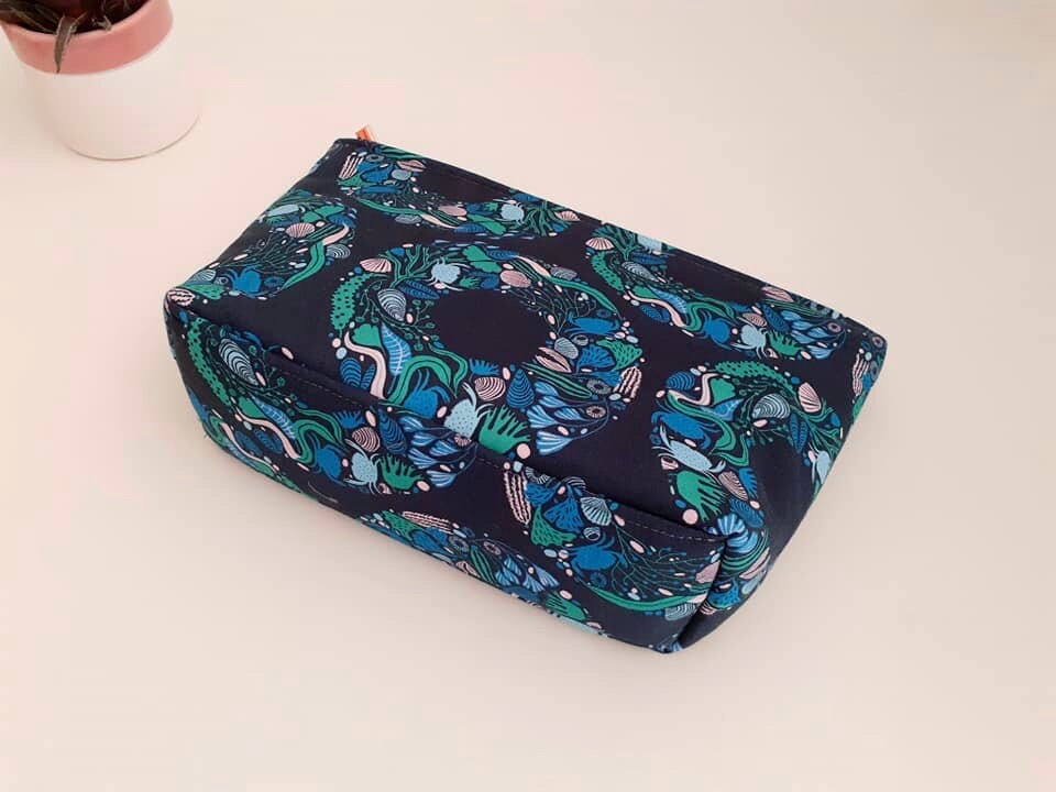 She comes in three sizes, small, medium and large. I chose the medium version for my prototype to show off this stunning "Sea Wreath" fabric from the Salt Water collection by Emily Taylor for Figo Fabrics. I've teamed it up with a pretty rose gold zip and a pop of turquoise inside.