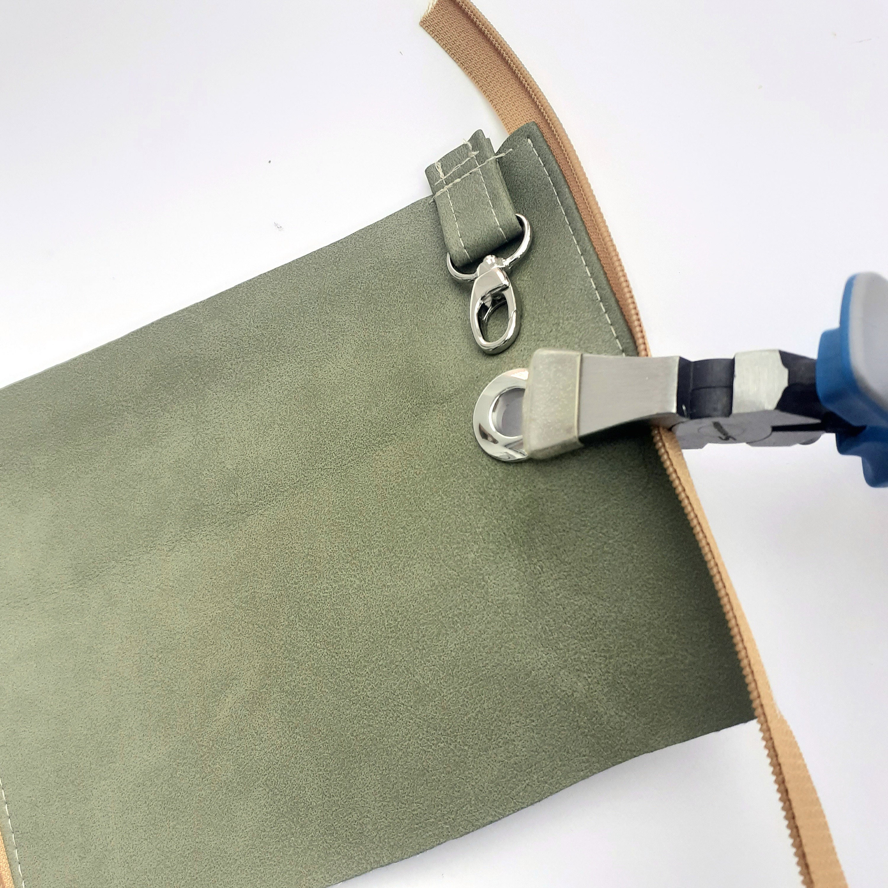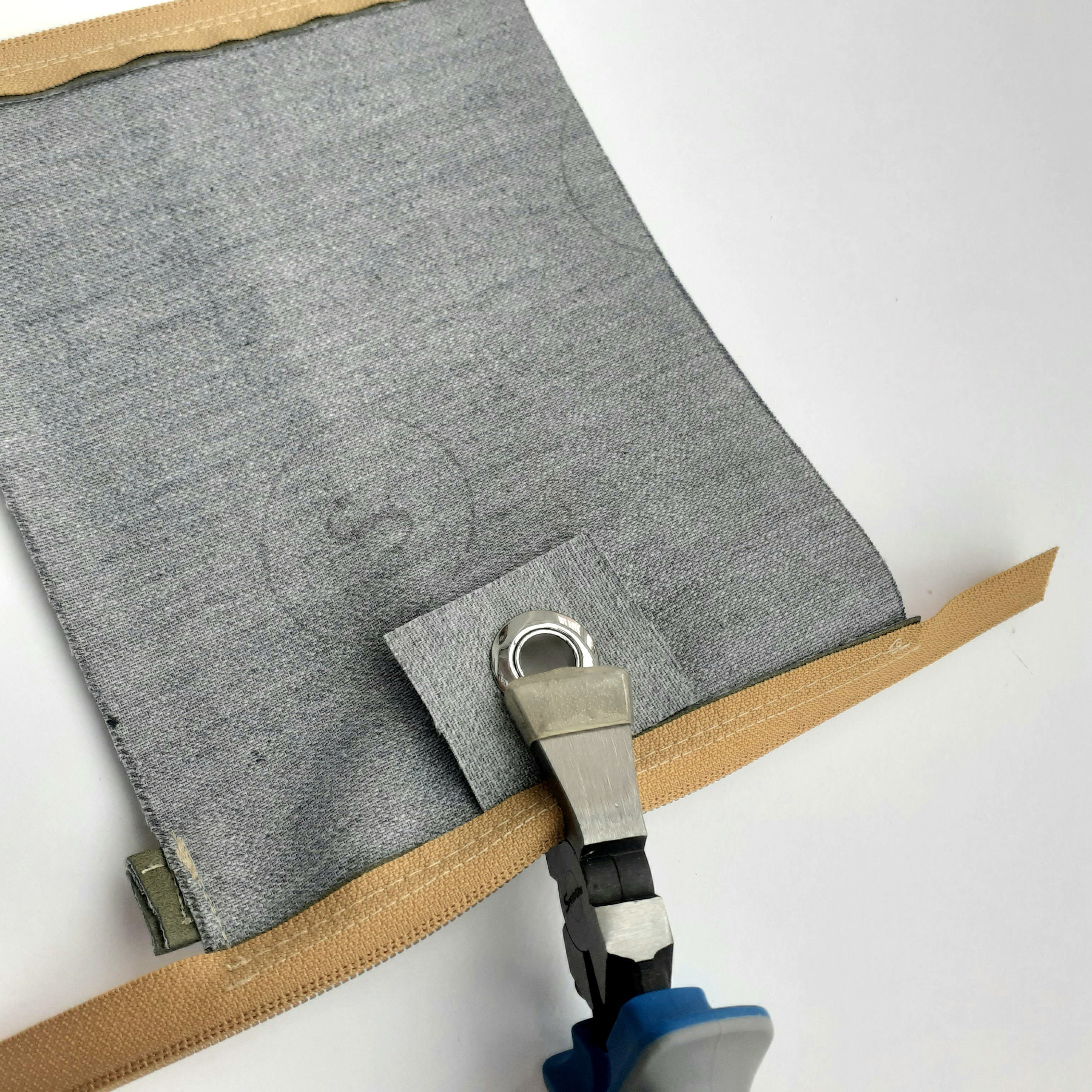 In the tutorial video, they use a hammer to bash the grommet sides together, but my trusty key fob pliers with rubber tips were perfect for this job without running the risk of scratching the metal.