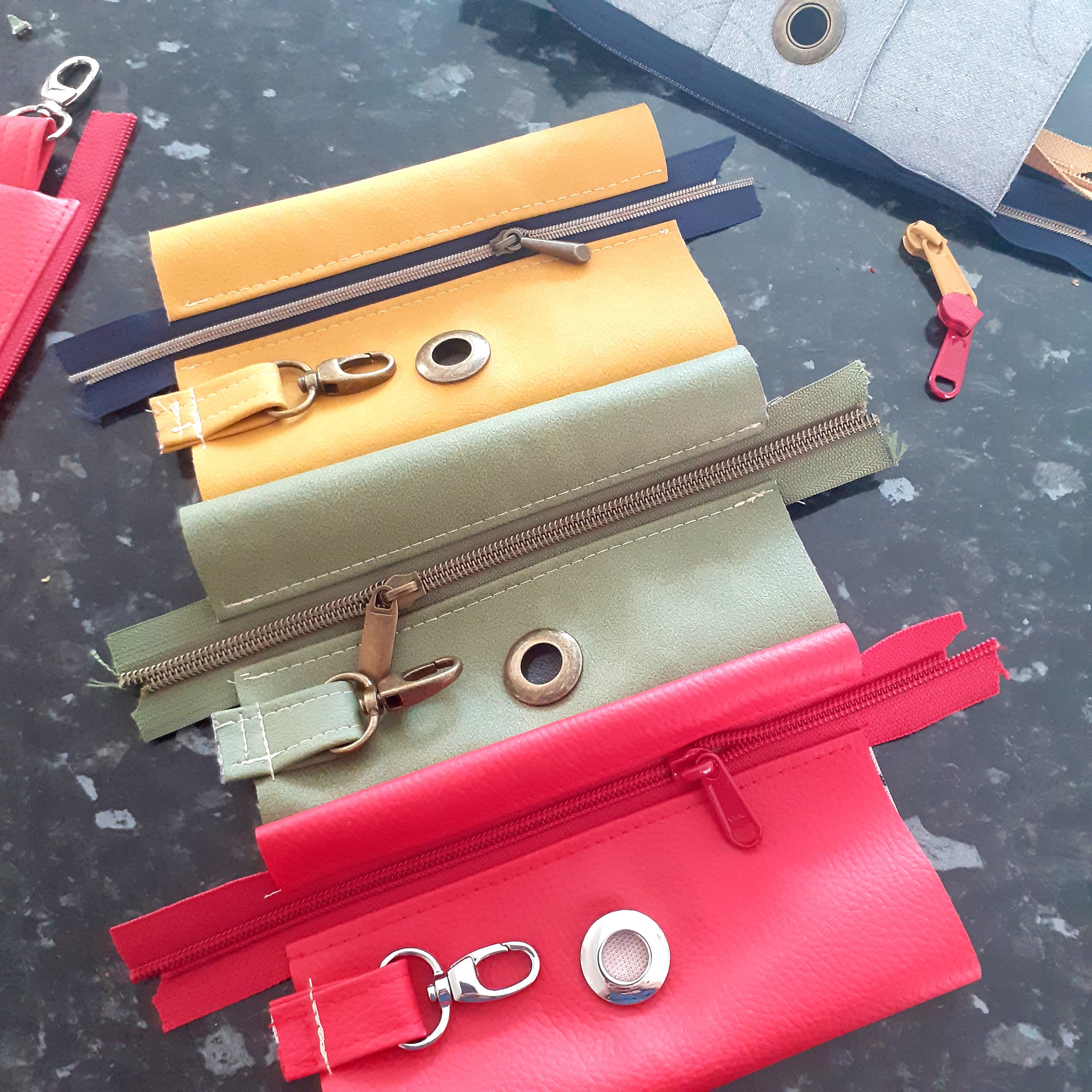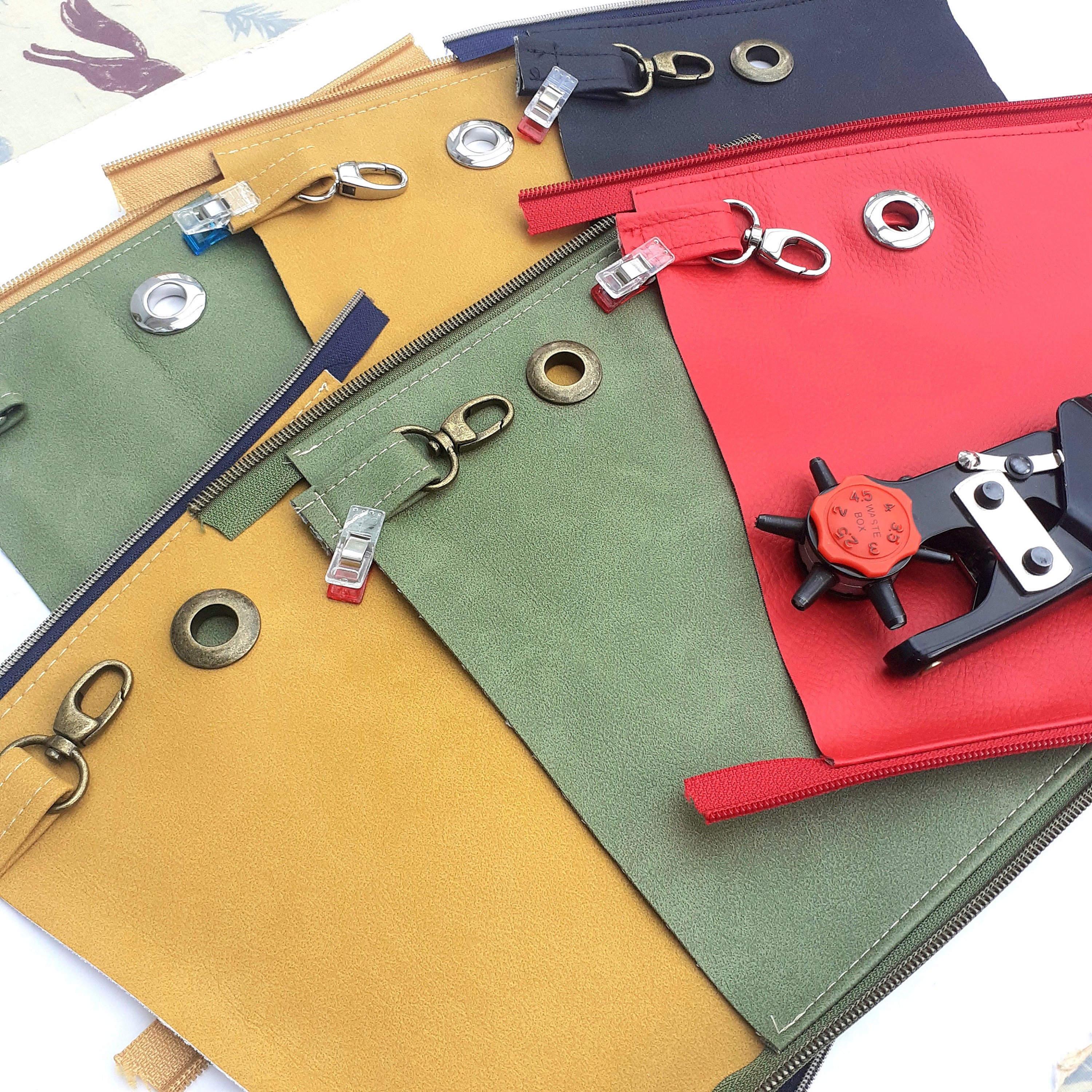 I used a mix of colourful faux leathers from Sew Hot. They also stock the right sized snap grommets, zippers by the yard and swivel snap hooks as well as the paper version of the Buddy pouch pattern*.