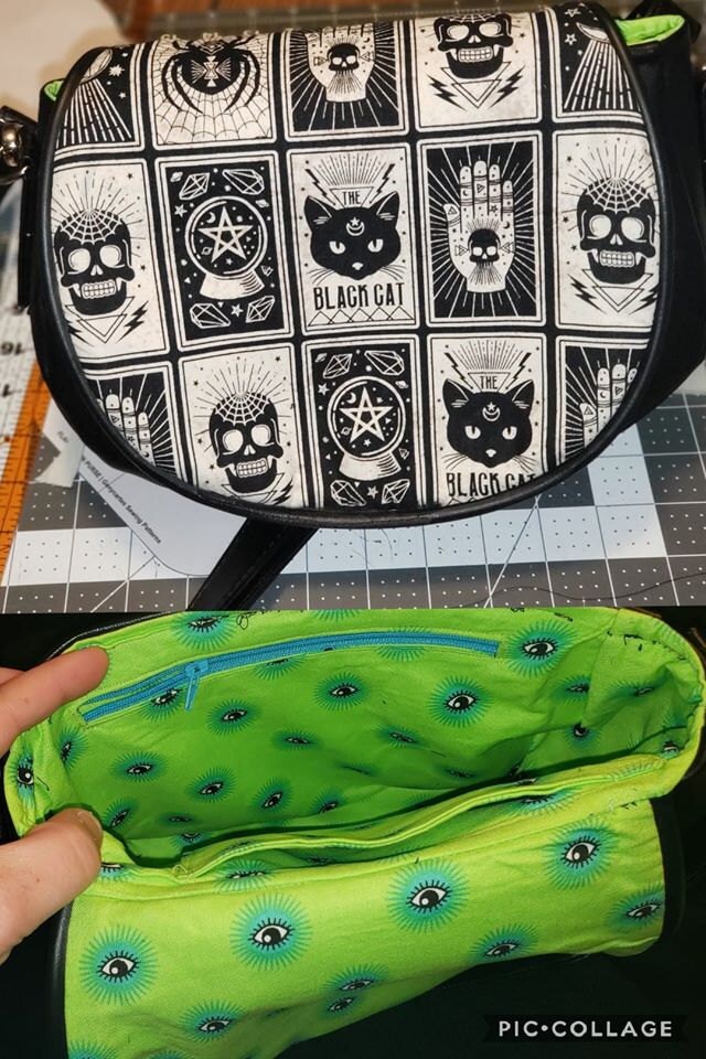 Kacy's bag in a fun fortune telling print with zesty lime green eyes inside says "The pattern was SUPERBLY written!"