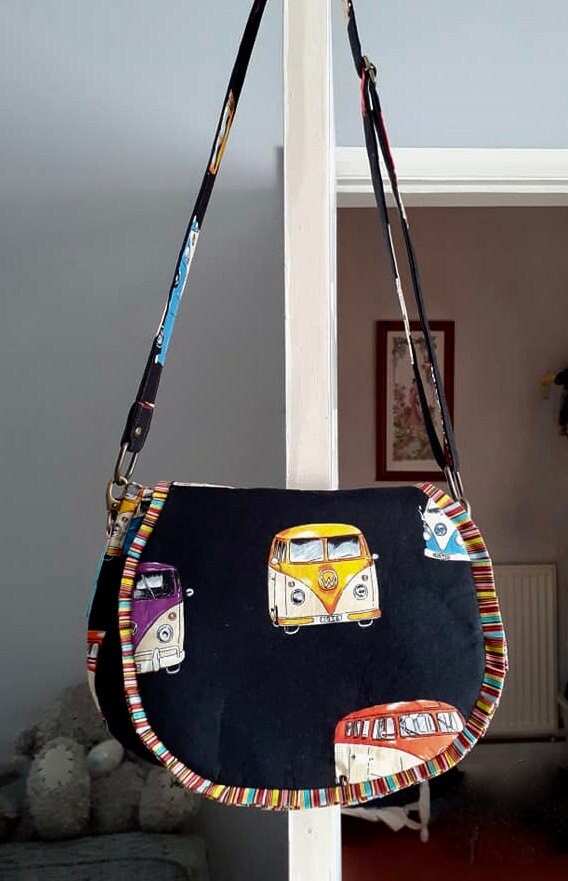 Alison (UK) chose a fun campervan print to feature on her Serena. She did not have piping cord to hand, so made her own stripy pleated binding instead for the flap and it came out super cute! "It came together lovely, (the pattern) reads so well and was so easy."