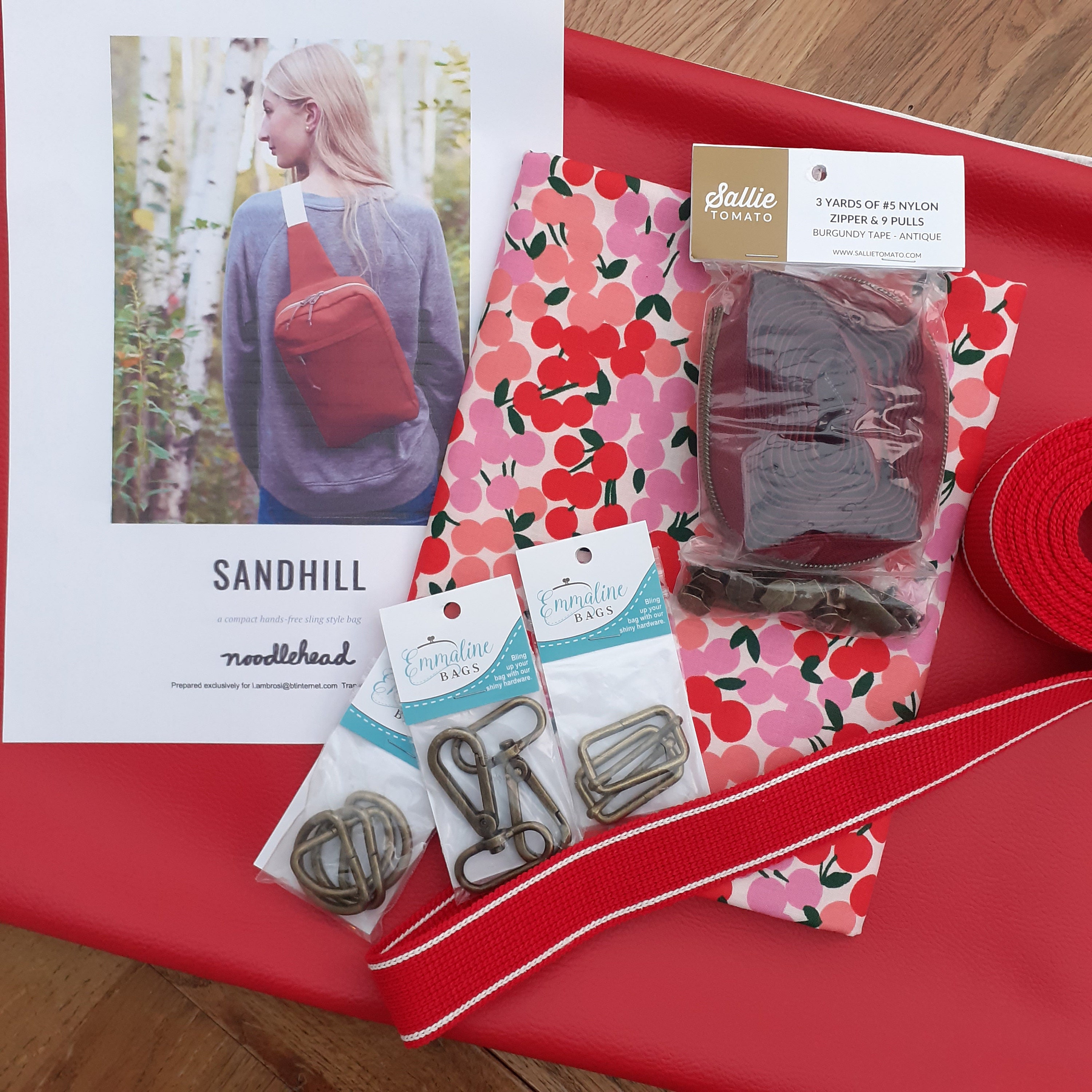 For my first project, I settled on the Sandhill Sling Pattern from Noodlehead. I bought a few extra bits of hardware and red cotton webbing from a vast selection at Sew Hot.