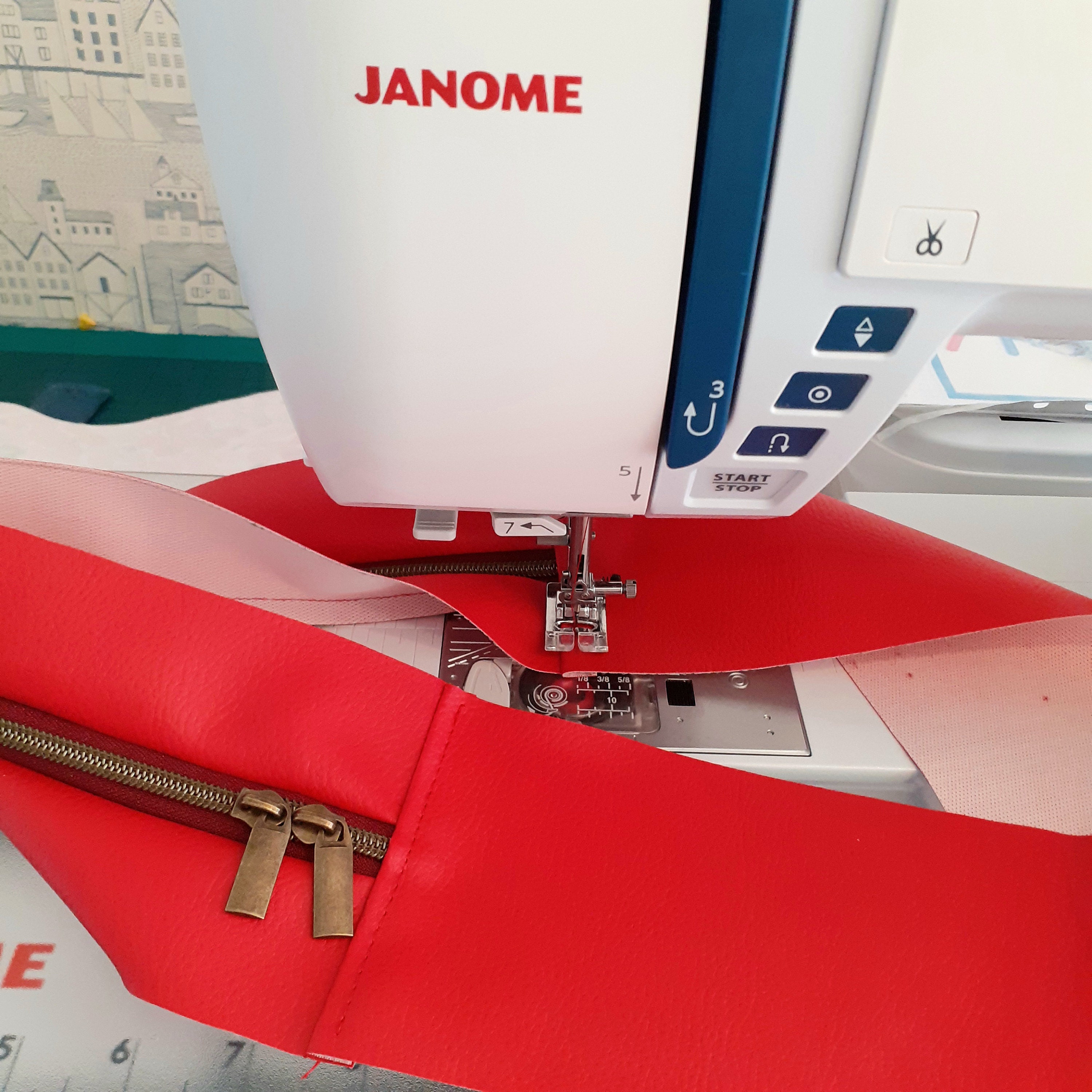 I initially used a Teflon foot on the faux Rex red leather, but it's so smooth and easy to sew that a standard foot will work just as well. I also used a Microtex needle to prevent the faux leather from tearing.
